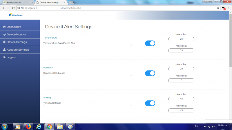 Gestión de dispositivos: menú de configuración individual para cada sensor, donde se definen límites de alarma, contactos de notificación y el tipo de equipo conectado.